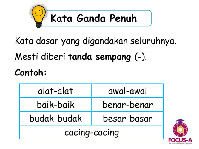 Penggandaan separa merupakan varian kepada sesetengah penggandaan penuh. Kata ganda bergambar 1. Berdasarkan jenis jenis kata ganda kategori ini terbagi lagi menjadi kata ganda penuh kata ganda separa dan kata ganda semukata ganda penuh atau dapat juga dikatakan kata ganda murni merupakan pengulangan kata secara utuh dimana bentuk kata tersebut tidak mengalami perubahan sama sekali.