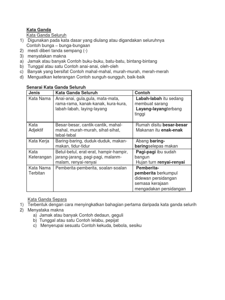 Latihan tatabahasa kata ganda. Penggandaan penuh kata tunggal terbahagi kepada 4 iaitu. Menurut tatabahasa dewan edisi dewan edisi bahasa nik safiah karim kata ganda ialah bentuk yang dihasilkan dengan menggandakan atau mengulang kata dasar tersebut diulang secara seluruhpada bahagian bahagian tertentu dengan imbuhan atau tanpa imbuhan.