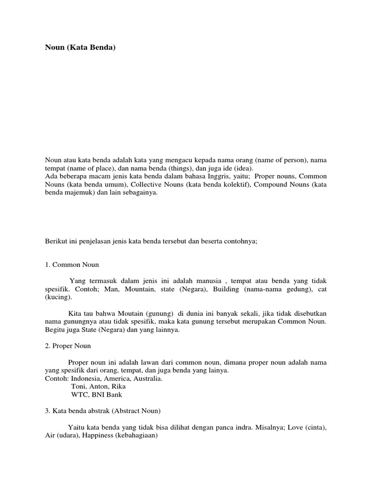 Common nouns kata benda umum proper nouns collective nouns kata benda kolektif compound nouns kata benda majemuk concrete noun abstract noun plural noun singular noun countable noun uncountable noun.