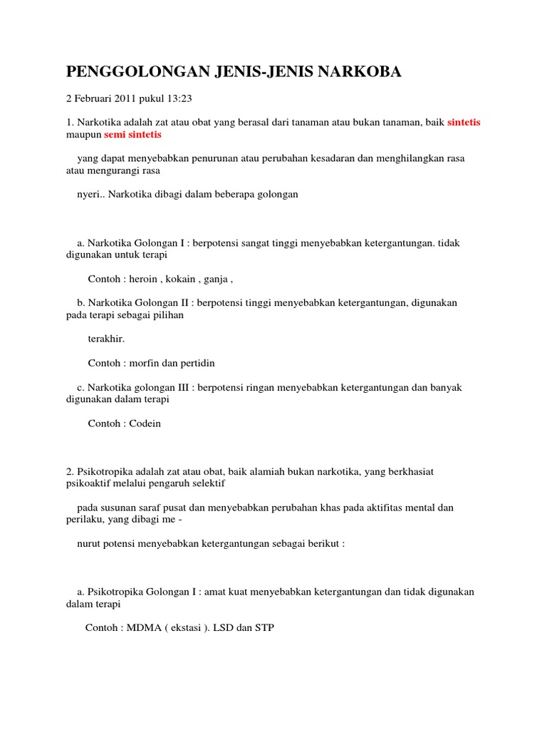 Tepatnya ada 65 jenis narkotika yang tergolog dalam narkotika golongan i berikut ini beberapa diantaranya narkotika golongan i yang perlu anda ketahui. Narkotika merupakan jenis zat atau obat yang berasal dari tanaman atau bukan tanaman baik secara sintetis maupun semi sintetis yang dapat menimbulkan. Artikel ini membahas mengenai narkotika psikotropika dan zat adiktif lainnya.