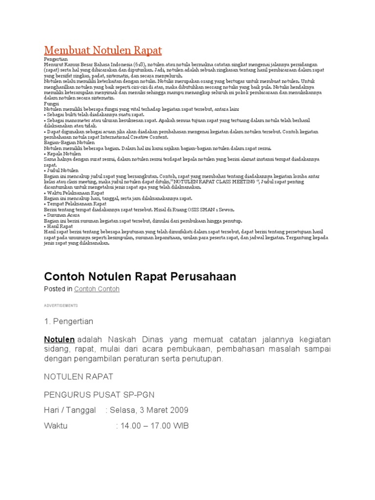 Agar sebuah rapat terdokumentasi sesuai prosedur maka sangat dibutuhkan sebuah notulen rapat. Menurut kamus besar bahasa indonesia 618 notulen atau notula bermakna catatan singkat mengenai jalannya persidangan rapat serta hal yang dibicarakan dan diputuskan. Contoh notulen yang benar untuk anda yang terbiasa melakukan kegiatan berorganisasi seperti seminar diskusi maupun rapat tentu sudah tidak asing lagi dengan yang namanya notulen dan berita acaraunuk masalah berita acara rapat sudah pernah kita bahas di postingan sebelumnya oleh sebab itu kali ini kita akan membahas cara membuat notulen yang baik dan benar.