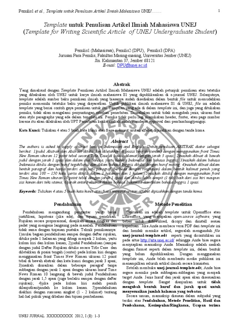 Naskah merupakan ringkasan hasil penelitian dari hibah penelitian dikti baik jenis hibah kompetitif nasional maupun hibah desentralisasi. Penulisan artikel jurnal umumnya mempunyai format berstandar internasional yang dikenal dengan aimrad singkatan dari abstract introduction material and methods results and discussion atau abstrak pendahuluan bahan dan metode hasil dan pembahasan. Penulisan tidak memakai format italic melainkan tegak lurus dengan memakai sebuah tanda kutip pembuka dan penutup.