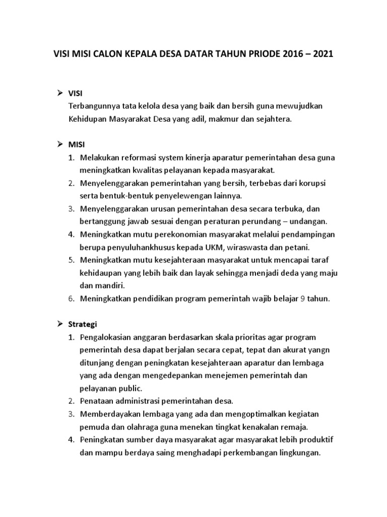 Visi Misi Calon Kepala Desa Datar Tahun Priode 2016