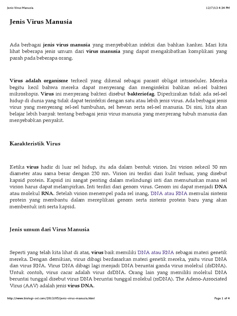 Ciri ciri virus dan contoh virus virus merupakan parasit berukuran mikroskopik yang menginfeksi sel organisme biologisvirus mempunyai sifat parasit obligat hal tersebut disebabkan karena virus hanya dapat bereproduksi di dalam material hidup dengan menginvasi dan memanfaatkan sel makhluk hidup karena virus tidak memiliki perlengkapan selular untuk bereproduksi sendiri. Salah satu yang paling umum adalah influenza yang menyebabkan orang terkena flu. Pada sel hanya ditemukan dna rantai ganda dan rna rantai tunggal sedangkan pada virus dapat anda temukan jenis virus dengan dna rantai tunggal serta ada juga yang rna rantai ganda.